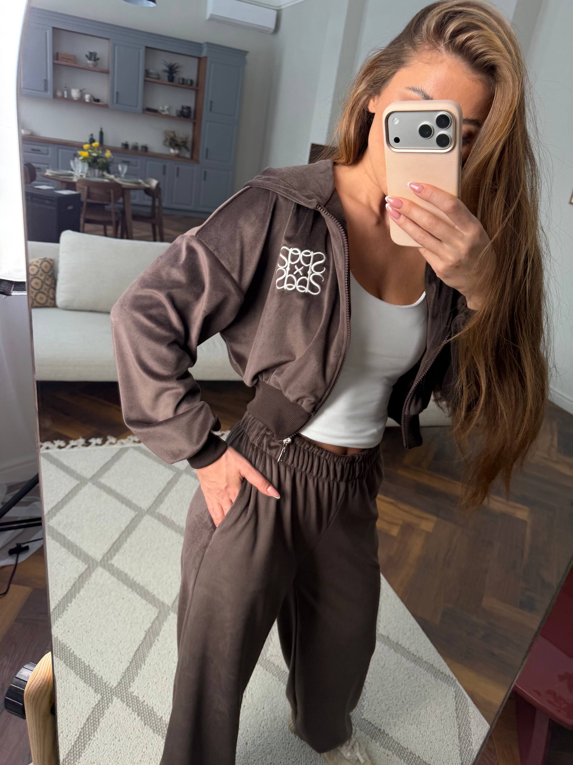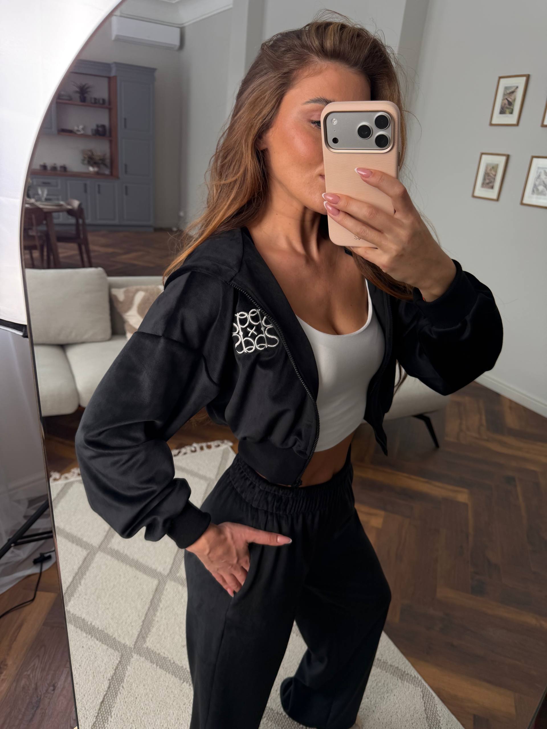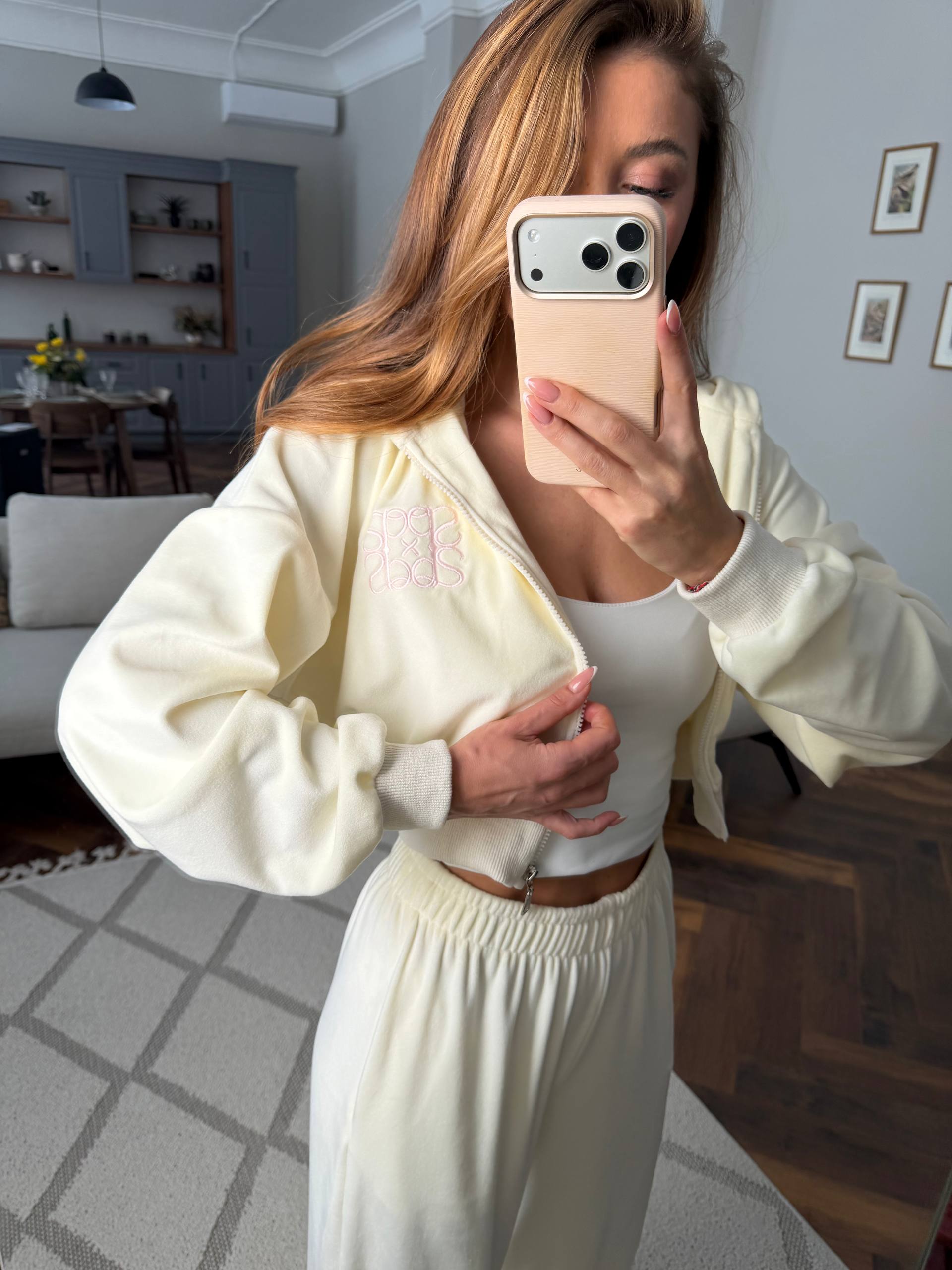 Кофта на блискавці з акуратною вишивкою додає образу преміальності, а вільні штани забезпечують максимальну зручність.