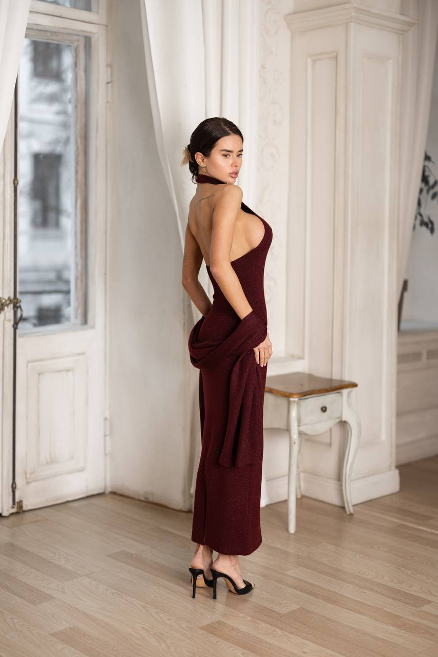 Елегантна довга сукня тонкої вʼязки облягаючого силуету з високим коміром-стійкою та відкритою спинкою. Лаконічний  крій підкреслює фігуру і створює витончений, сучасний образ. В комплект входить легка накидка, яку можна носити на плечах або навколо рук, додаючи образу легкість та варіативність.