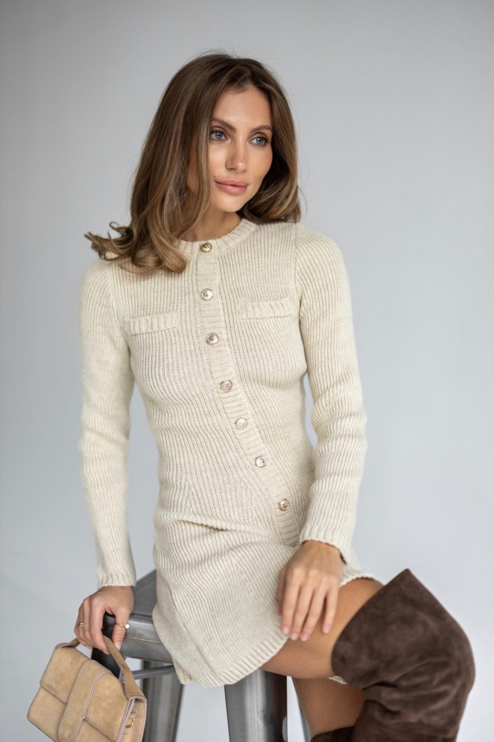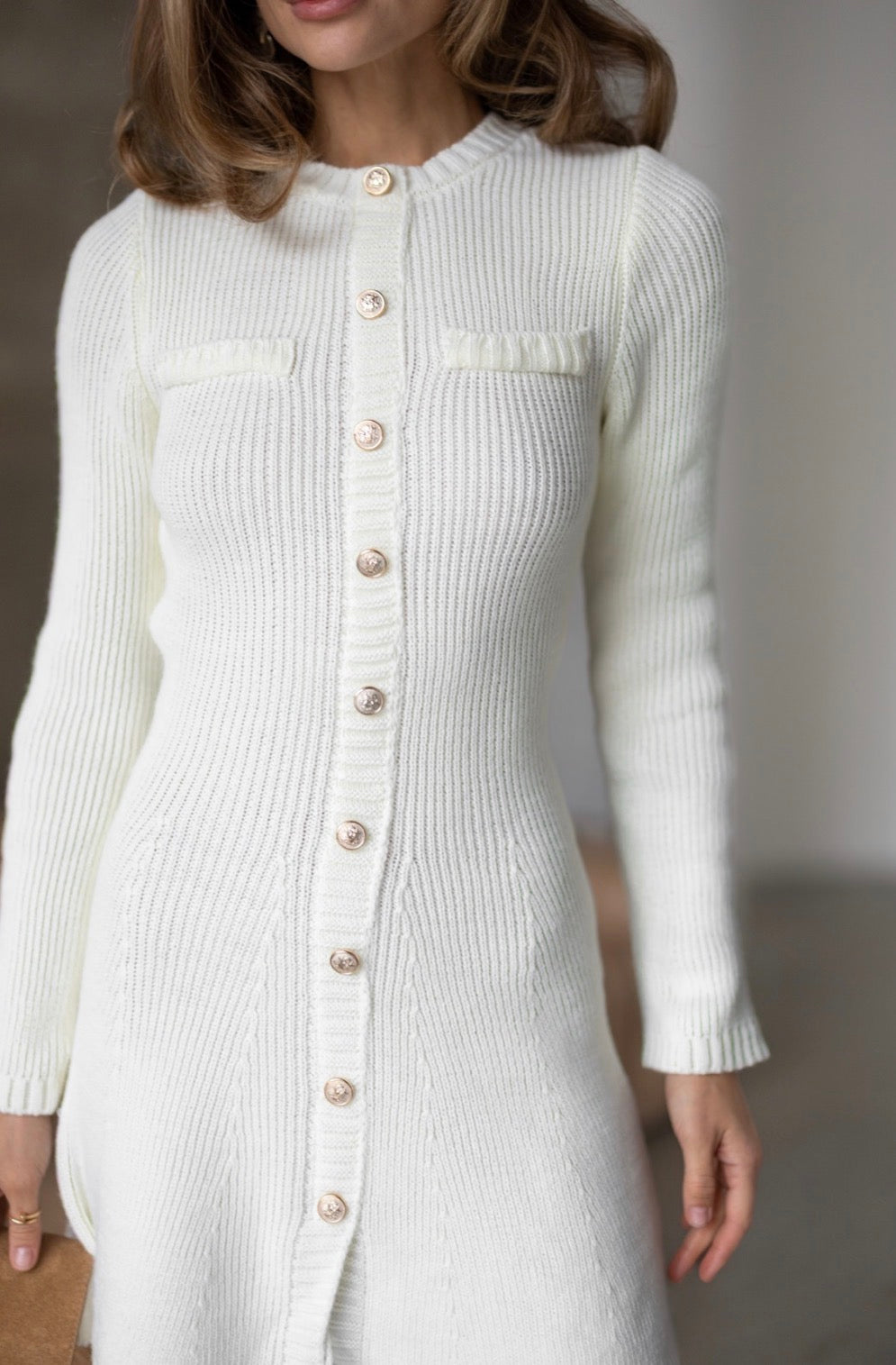 Коротка в'язана сукня з акцентною планкою на ґудзиках — це сучасне переосмислення класики. Приталений силует підкреслює фігуру, вертикальна в'язка візуально витягує лінії, а акуратні кишеньки створюють легкий натяк на ретро-шик.