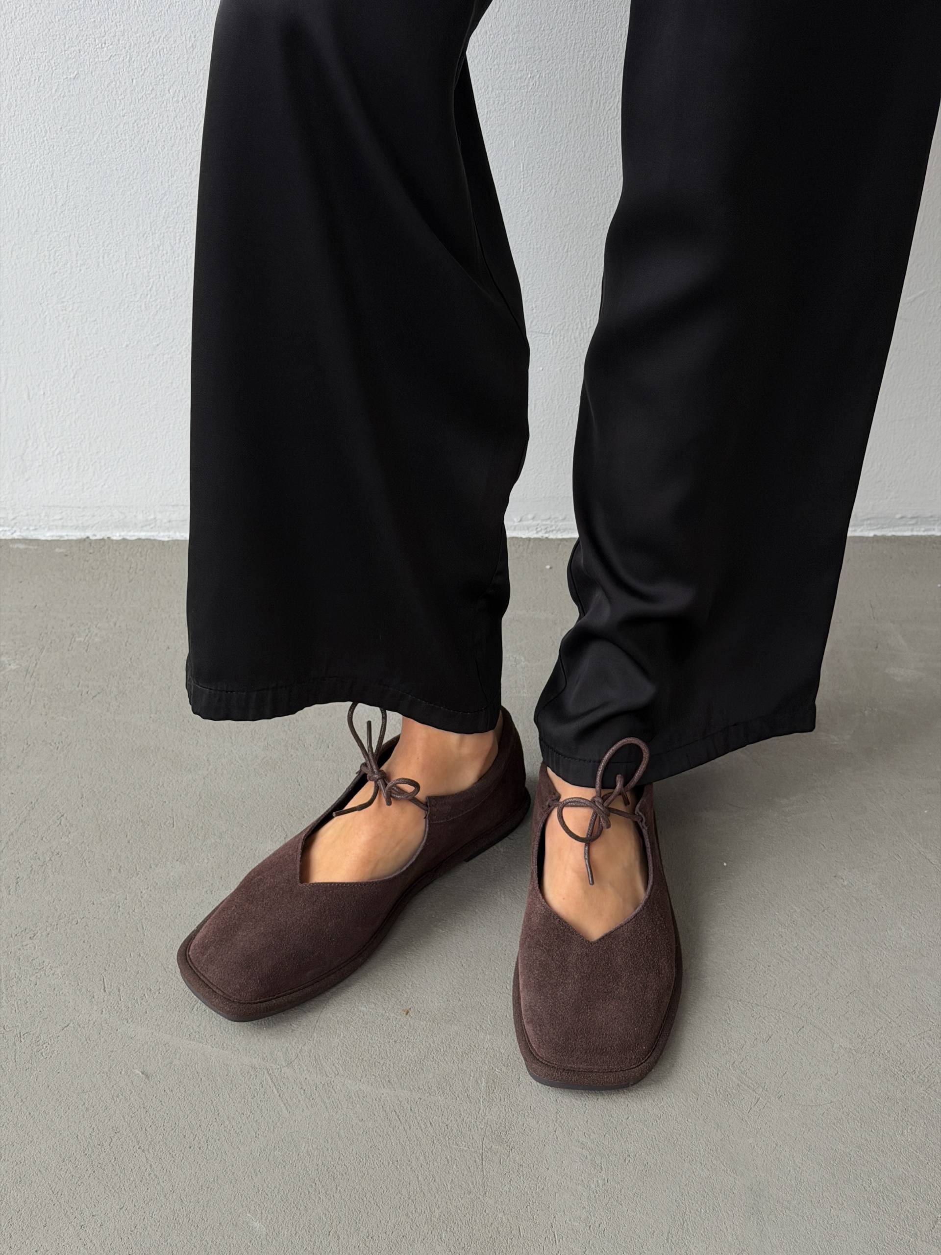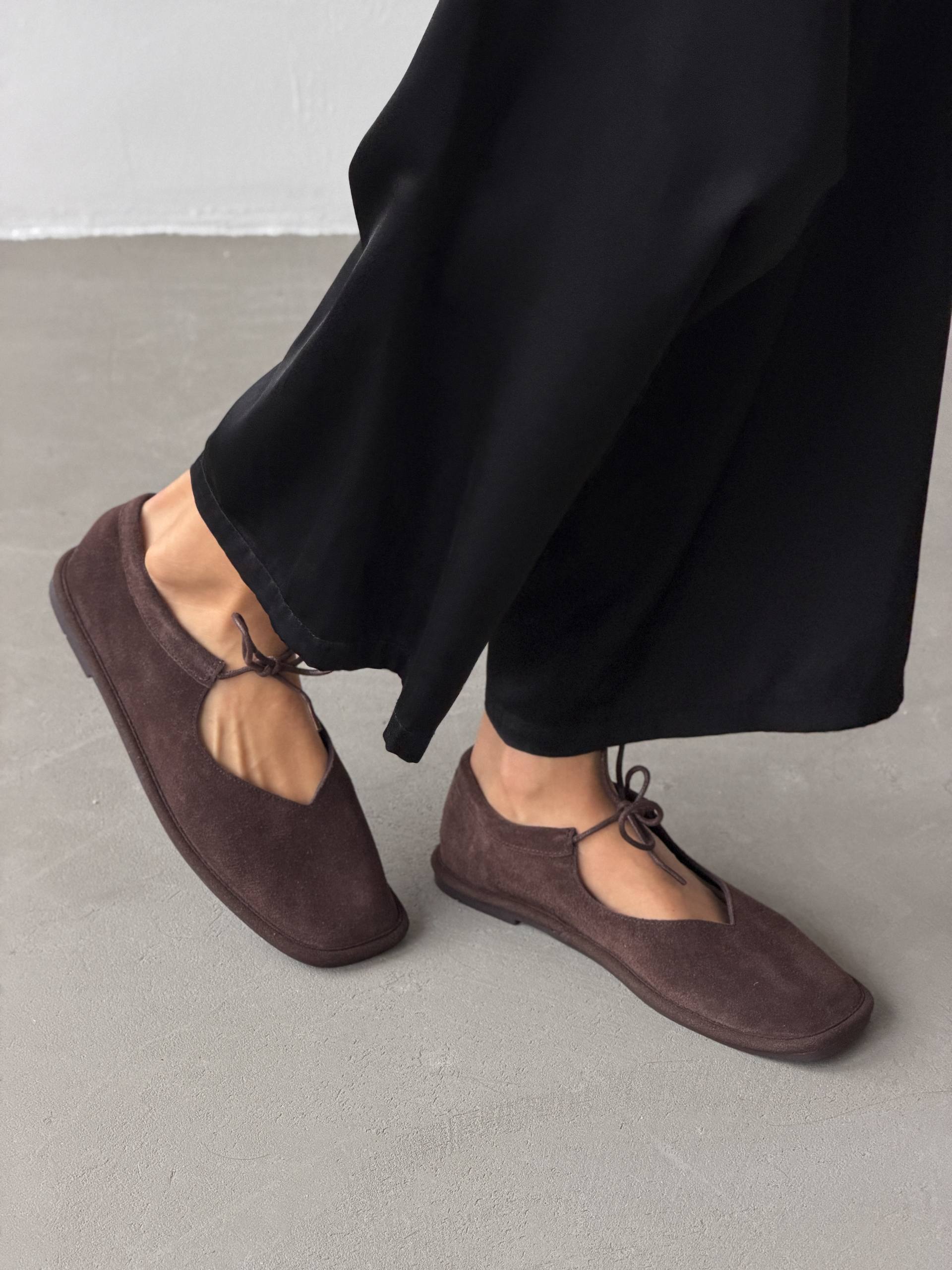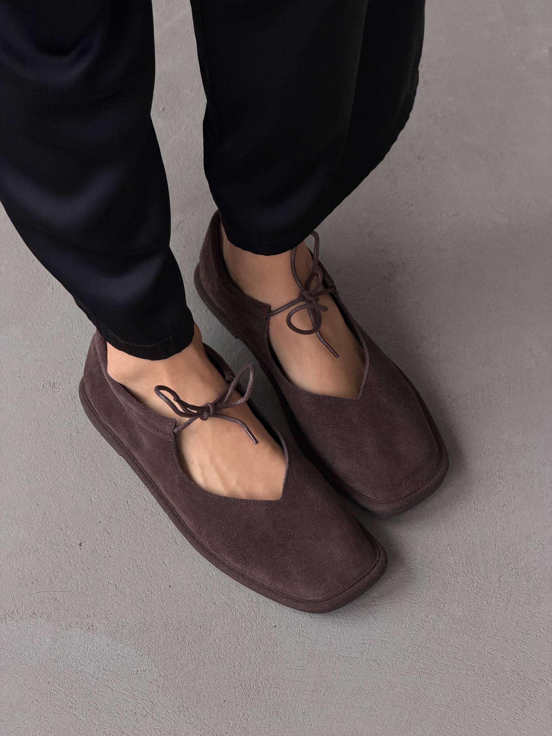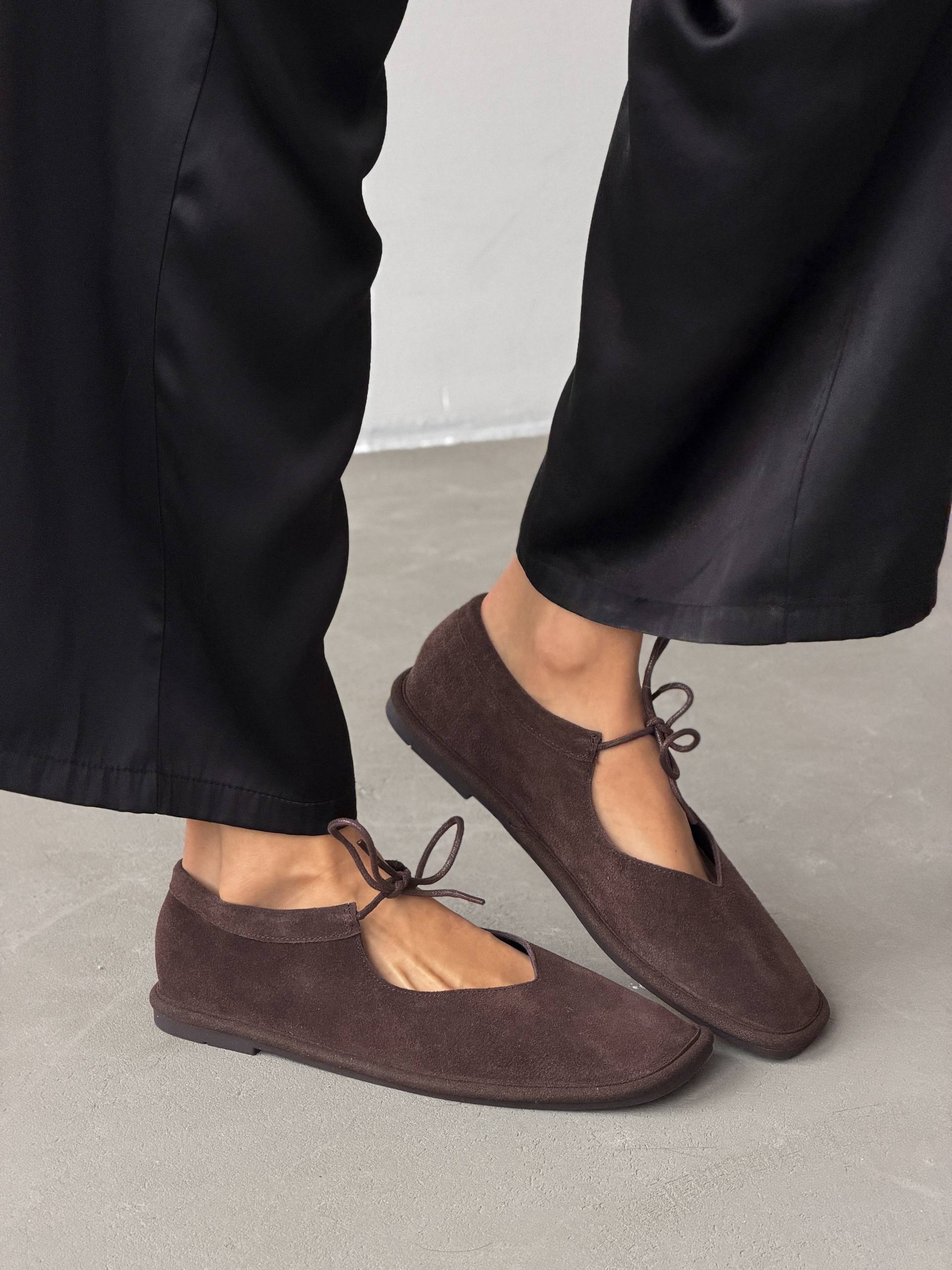 Балетки на зав'язках з анатомічно-розширеним носиком, шоколад